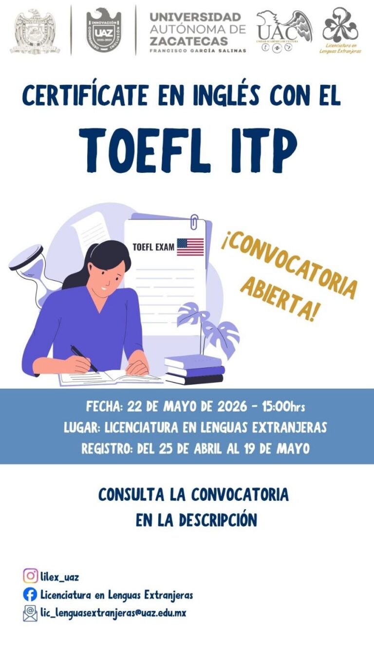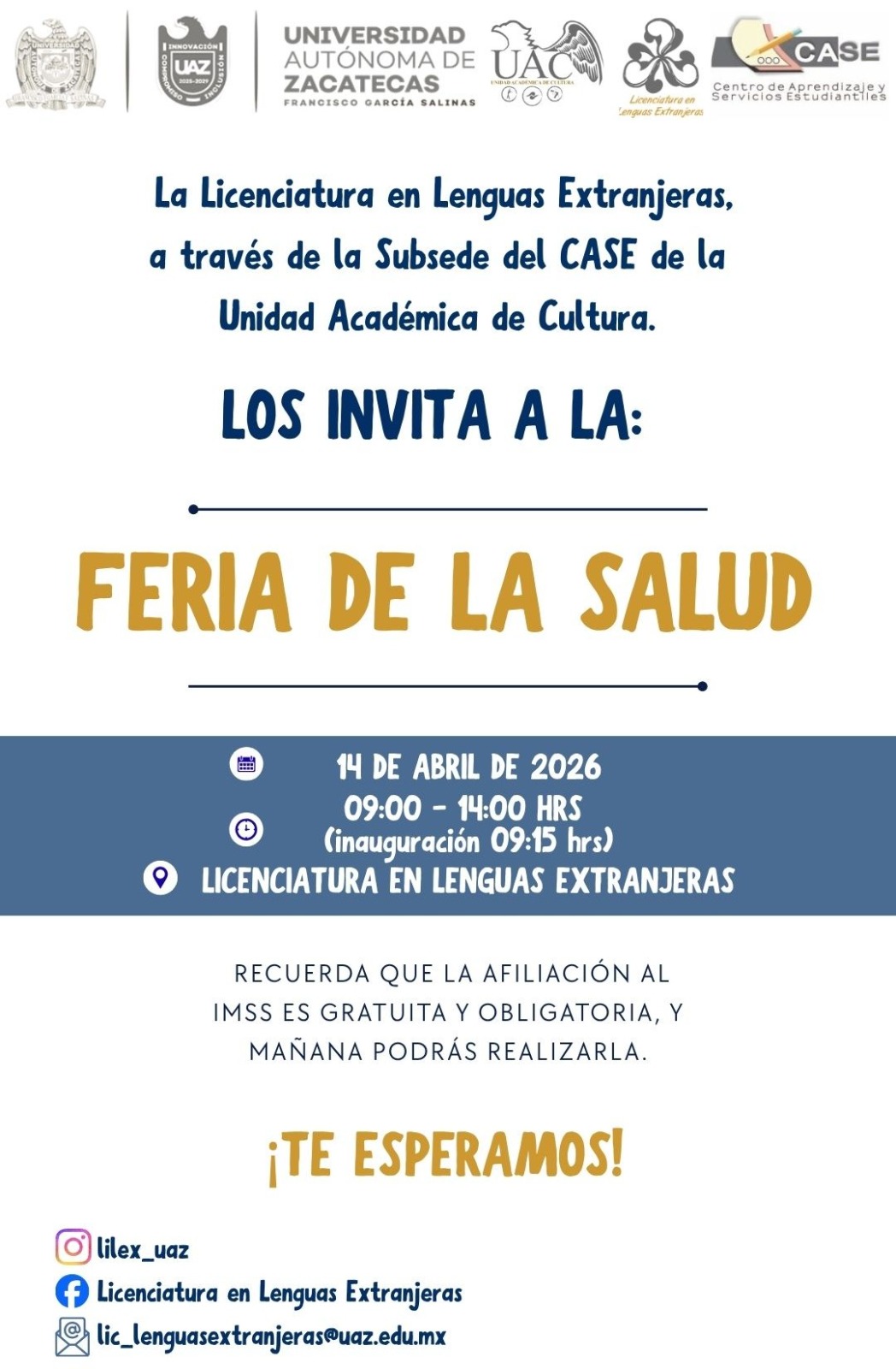Bienvenido| Welcome| Bienvenue| Benvenuto| Willkommen Conócenos PropósitosHistoriaAdministración 2025-2029Plan de DesarrolloDocentesInstalaciones Aspirantes Perfil de ingreso/ egresoAdmisiónMapa curricularTríptico informativo Estudiantes TutoríasPrácticas ProfesionalesServicio SocialCalificacionesEducación a distanciaDescargasCALEX Egresados TitulaciónSeguimiento de egresados 2025Bolsa de trabajo LILEXVinculación UAZ Normatividad InstitucionalInterna Sitios de interés Universidad Autónoma de Zacatecas Servicios EscolaresServicios Estudiantiles (CASE)Centro de Información Siglo XXIBiblioteca CentralMovilidad e IntercambioProyectos FederalesGenerar Ficha de Pago Horarios Enero-Julio 2026 Noticias Eventos Noticias Becas de Hospedaje y Alimentación (Ago-Dic 2025) Eventos Feria de la Salud 2026Festival de Italiano 2026